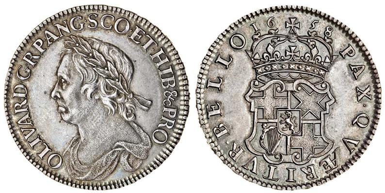 (x) Cromwell, Halfcrown, 1658, laureate, draped bust left, rev. crowned arms of the Protectorate, edge inscribed (ESC 447; S.3227A), toned, most attractive, good extremely fine, rare