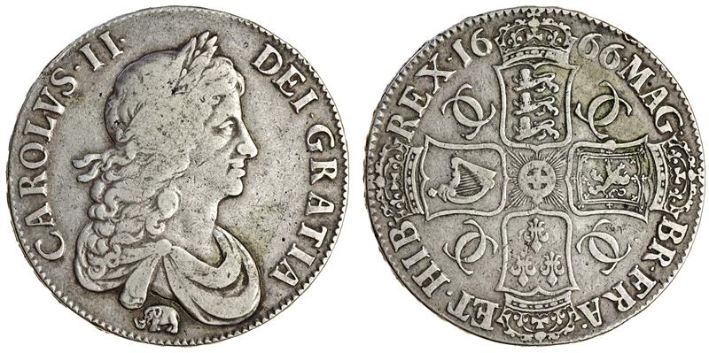 (x) Charles II, Crown, 1666 xviii, second laureate, draped bust right, elephant below, rev. four crowned shields cruciform (ESC 33; S.3356), pleasing elephant, good fine, rare