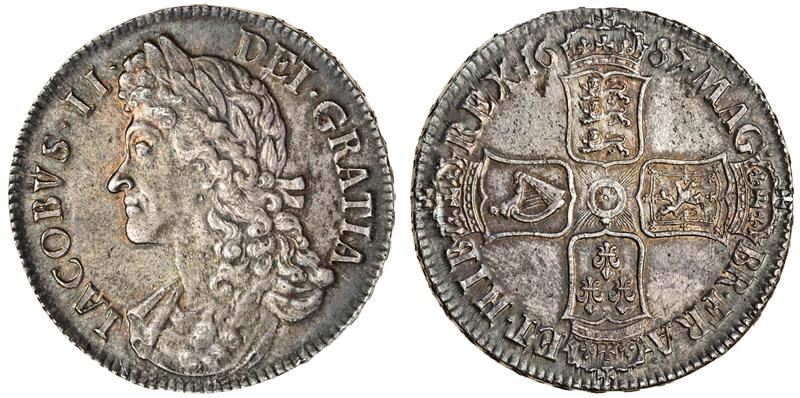 (x) James II, Crown, 1687 tertio, second, laureate, draped bust left, rev. four crowned shields cruciform (ESC 78; S.3407), small flan flaw by date, toned, almost extremely fine