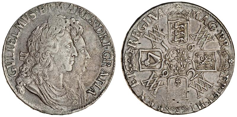 William and Mary, Crown, 1692 qvarto, laureate, draped conjoined busts right, rev. four crowned shields cruciform, monogram in angles (ESC 83; S.3433), almost very fine