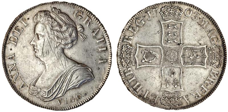 Anne (1702-14), pre-Union, Crown, 1703 tertio, draped bust left, vigo. below, rev. four crowned shields cruciform (ESC 99; S.3576), adjustment marks on bust, very fine / good very fine
