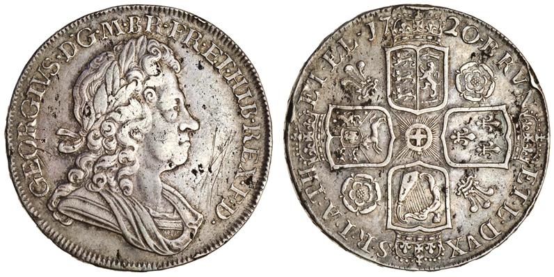George I, Crown, 1720/18 sexto, laureate, cuirassed and draped bust right, rev. four crowned shields cruciform, roses and plumes (ESC 113; S.3639), two edge knocks, marks in field to right of bust, very fine