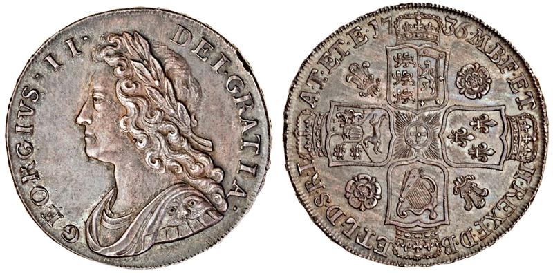 (x) George II, Halfcrown, 1736 nono, young laureate, cuirassed and draped bust left, rev. four crowned shields cruciform, roses and plumes (ESC 599; S.3692), even dark tone, light adjustment marks, good extremely fine