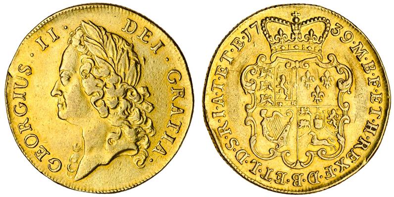 (x) George II, Two Guineas, 1739, intermediate laureate head left, rev. crowned garnished shield (MCE 293; S.3668), edge bruise, very fine
