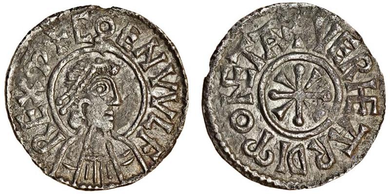Mercia, Coenwulf Penny, 1.16g, cross and wedges types, c.805-10, Canterbury, Werheard, diademed bust right, legend commencing at 11 o'clock, +coenvvlf rex m, uncial m, rev. cross and wedges within inner circle, +verheardi moneta, uncial m (Naismith C28 - not listed; N.349; S.915), sometime cleaned, full flan, about very fine, rare