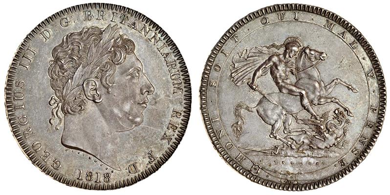 George III, Crown, 1818 lix, laureate head right, rev. St George and dragon (ESC 214; S.3787), adhesion on surface in front of horse, even grey tone, almost uncirculated
