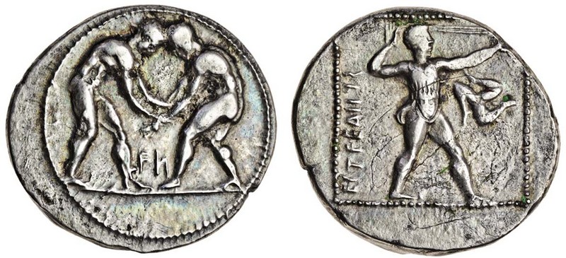 Pamphylia, Aspendos (c.380-325 BC), AR Stater, 10.52g, two wrestlers grappling, Pamphylian letters between them, rev. etfeiiy (Pamphylian script), slinger standing right, wearing short chiton, loosing shot, triskeles to right, all within dotted linear square (SNG France 99-100; BMC 41), very fine