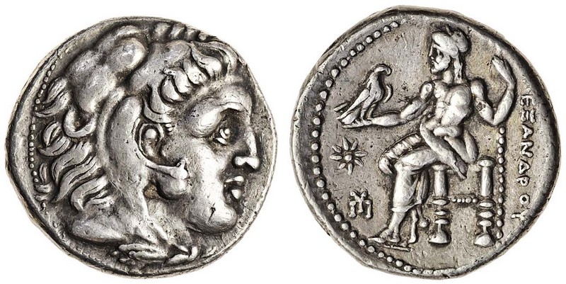 Kingdom of Macedon, Alexander III, the Great (336-323 BC), AR Tetradrachm, 16.99g, Sardes, c.319-315 BC, head of young Herakles right, wearing lion's skin headdress, rev. aeanpoy, Zeus enthroned left, holding eagle and sceptre, star and monogram to left (Price 2665; SNG Oxford 2840), a really attractive example, good very fine