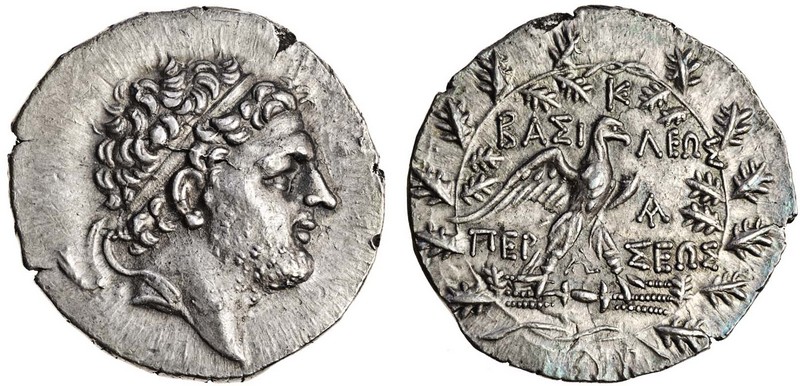 Kingdom of Macedon, Perseus (179-168 BC), AR Tetradrachm, 15.54g, diademed head right, rev. baie epe, eagle with spread wings standing facing, turned slightly right, on thunderbolt, monograms above and to right, all within oak-wreath, traces of plough below (SNG Cop. 1269 var.), toned, extremely fine