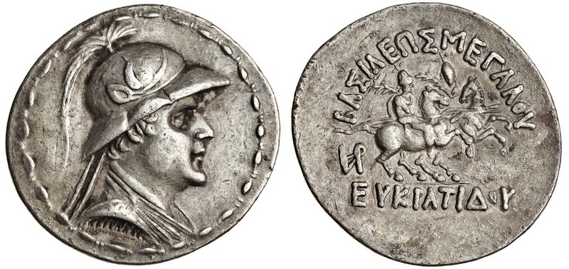 Kingdom of Bactria, Eukratides (170-145 BC), AR Tetradrachm, 16.76g, diademed and draped bust right, wearing crested helmet ornamented with bull's horn and ear, rev. baie meaoy eykpatioy, the Dioscuri on horseback right, each carrying spear and palm-branch, monogram behind (BN series 6, 47-48), broad flan, very fine