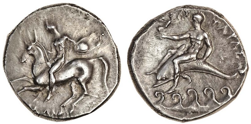 Calabria, Tarentum (c.302-280 BC), AR Stater, 7.97g, naked rider on cantering horse left, holding shield, [i]n below, rev. tapa, Taras astride dolphin left, holding out a figure of Nike, stylised waves below (Vlasto 685; SNG ANS 1060; Hist. Num. 964; ), toned, extremely fine