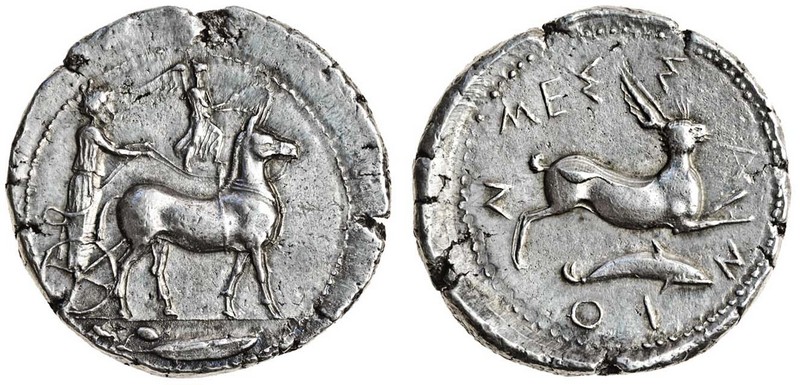 Sicily, Messana (425-421 BC), AR Tetradrachm, 17.29g, the nymph Messana driving slow biga of mules right, Nike hovering above to crown mules with wreath, olive-leaf and fruit in ex., rev. meanion, hare springing right over dolphin right (Caltabiano 488, D223/R231; Dewing 652), excellent metal, edge lightly hammered, about extremely fine