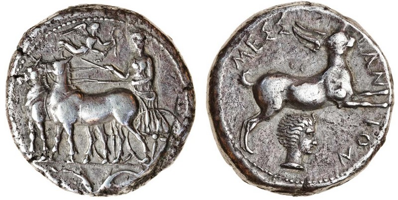Sicily, Messana (412-408 BC), AR Tetradrachm, 17.09g, the nymph Messana driving biga of slow mules left, Nike flying right above to crown her with wreath, two opposed dolphins in ex., rev. meanion, hare springing right over head of Pan right (Caltabiano 611), toned, very fine