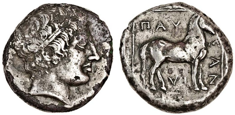Kingdom of Macedon, Pausanias (390-389 BC), Stater, 7.59g, silver plated on an bronze core, head right hair bound with tainia, rev. ay-a-i, horse standing right within linear border within shallow incuse square (SNG ANS 86), nearly very fine