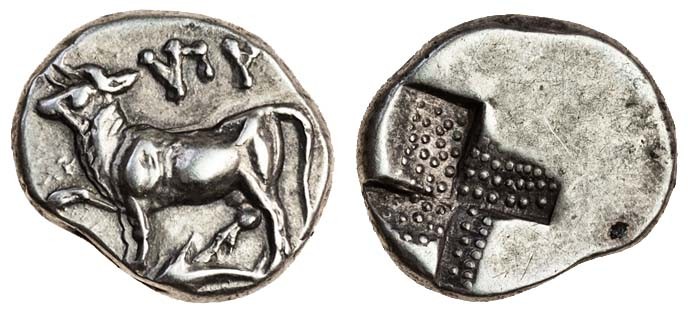 Thrace, Byzantium (mid 4th cent. BC), AR Tetrobol, 2.36g, heifer standing left on dolphin, rev. incuse square of “mill sail” pattern (SNG Cop. 475ff), good very fine