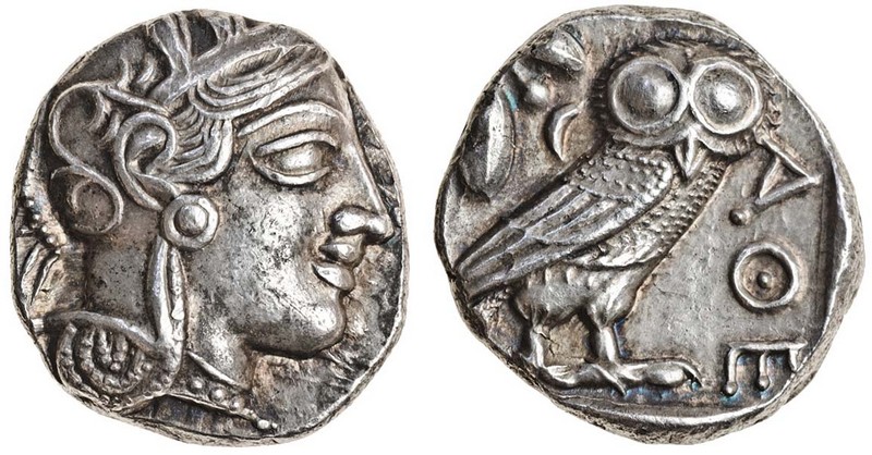 Attica, Athens (c.430-400 BC), AR Tetradrachm, 17.16g, helmeted head of Athena right, wearing earring, necklace and crested helmet ornamented with spiral and olive leaves, rev. ae, owl standing right, head facing, olive twig and crescent behind, all in an incuse square, good very fine
