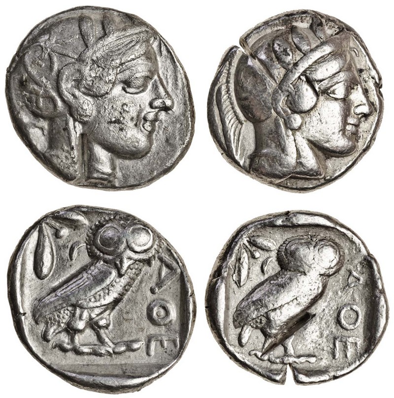 Attica, Athens, AR Tetradrachms (3), post 440 BC, helmeted head of Athena right, rev. owl standing right, head facing (2), one with two test-cuts, 4th cent BC, similar types (1), fine to almost very fine (3)
