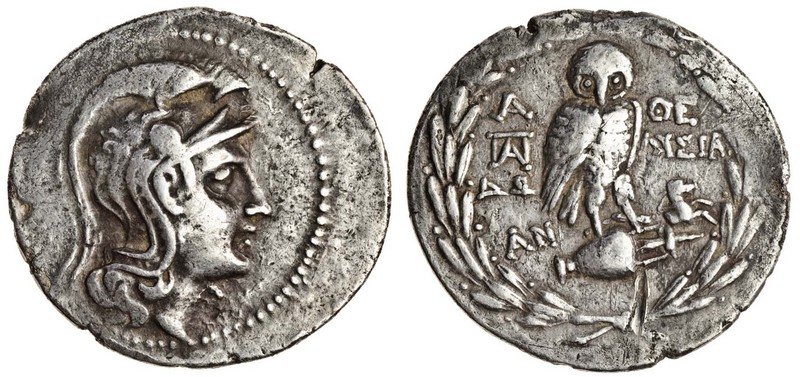 Attica, Athens (177-176 BC), AR Tetradrachm, 16.35g, helmeted head of Athena right, rev. owl standing right, head facing, on upturned amphora, yia and to left, forepart of horse to right, all in wreath (Thompson 159), old scratch below amphora, almost very fine