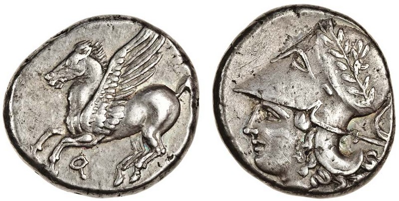 Corinth (c.345-307 BC), AR Stater, 8.50g, Pegasos flying left, koppa below, rev. head of Athena left, wearing helmet decorated with laurel wreath (Ravel 1022; Peg. 441), good very fine