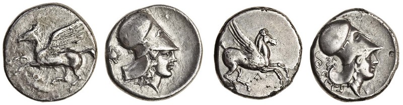Corinth (4th cent. BC), AR Stater (2), 8.23g Pegasos flying left, rev. helmeted head of Athena right, uncertain symbol behind, Corinth, Colonies, Leukas, AR Stater, 8.27g, similar but Pegasos right, symbol coiled snake and e behind Athena, both about very fine (2)