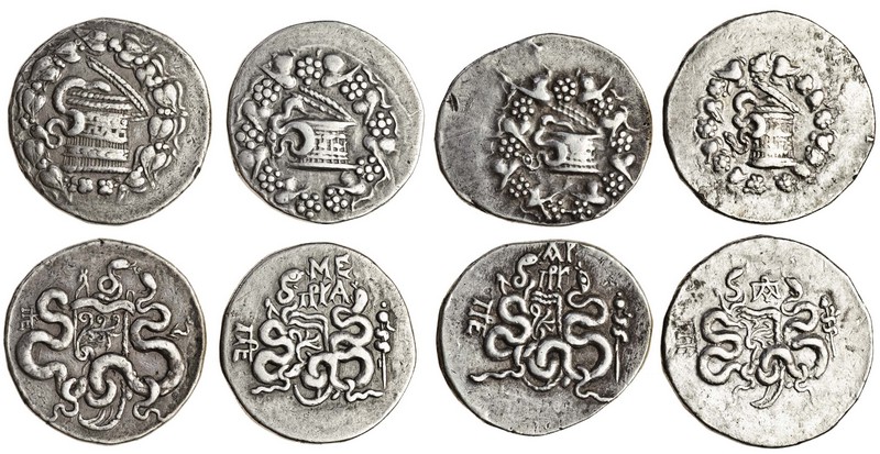 Mysia, Pergamum (later 2nd cent BC-early 1st cent. BC), AR Cistophori (4), serpent emerging from cista mystica, all within ivy-wreath, rev. bow-case between two erect serpents, thyrsus on right, dates above on two, a monogram above on one and a coiled serpent above on the last, almost very fine 4)