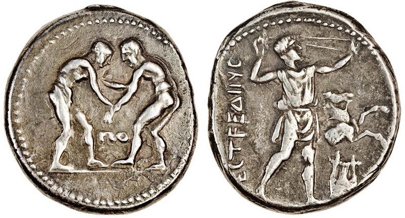 (x) Pamphylia, Aspendos (c.330/25-300/250 BC), AR Stater 10.59g, two wrestlers, o between, rev. inscription behind standing slinger, forepart of horse in field to right above lyre (SNG France 113), very fine