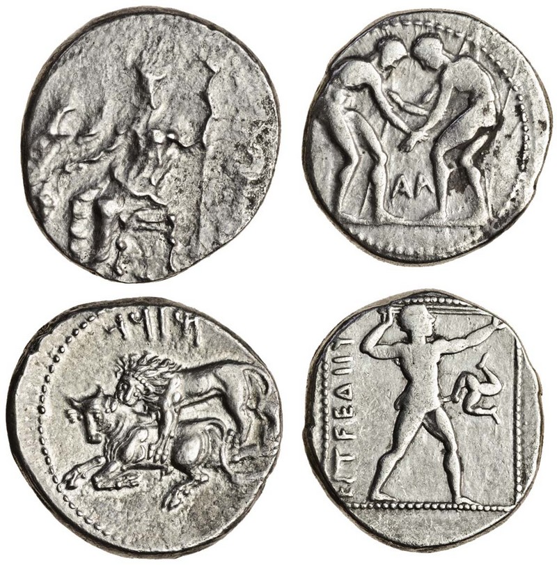 Cilicia (2), Tarsos, Satrap Mazaios (361-334 BC), AR Stater, 10.72g, Baal enthroned left, holding eagle, grapes, ear of grain, and sceptre, rev. lion attacking bull left (cf SNG Levante 103), worn obverse die, good fine, reverse good very fine,  Aspendos (4th cent. BC), Stater, 10.94g, two wrestlers grappling, aa between them, rev. slinger standing right, loosing shot (SNG France 81), good fine (2)