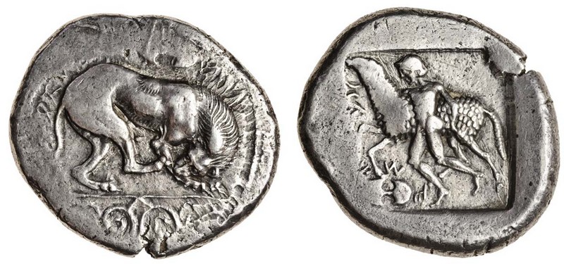 Cyprus, Marion, Sasamorios (c.470-450 BC), AR Stater, 11.18g, lion right, licking right foreleg, Boeotian shield above, traces of Cypriot script, floral pattern in ex., rev. Phrixos left, restraining ram by neck left, Boeotian shield below, Cypriot script ("of Marion"), all in incuse square (BMC 1 as Traité II, 1366), good metal, very rare, very fine