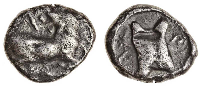 Cyprus, Paphos, uncertain king (Pasi..?) (mid 5th cent BC), AR Stater, 10.40g, human(?)-headed bull kneeling right, head turned back (the river Bokaros), rev. astragalos, Cypriot letters on left and right (cf BMC , pl. VII,1, and pl.XXI, 1-2), an extremely rare coin, toned, good fine to almost very fine