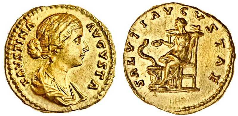 Faustina Junior, Aureus, 7.46g, Rome, draped bust, with hair drawn into a bun, right, favstina avgvsta, rev. salvti avgvstae, Salus seated left feeding snake twined around an altar from a patera (RIC 716; C.198) some lustre, attractive, almost extremely fine