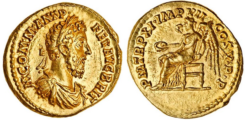 Commodus (180-92), Aureus, 7.26g, Rome, 185, laureate, bearded, draped and cuirassed bust right, m. comm. ant. p fel. avg brit, rev. p m tr p xi. imp vii cos v. p. p, Victory seated left holding patera and palm branch (RIC 123 var.), lustrous, almost extremely fine