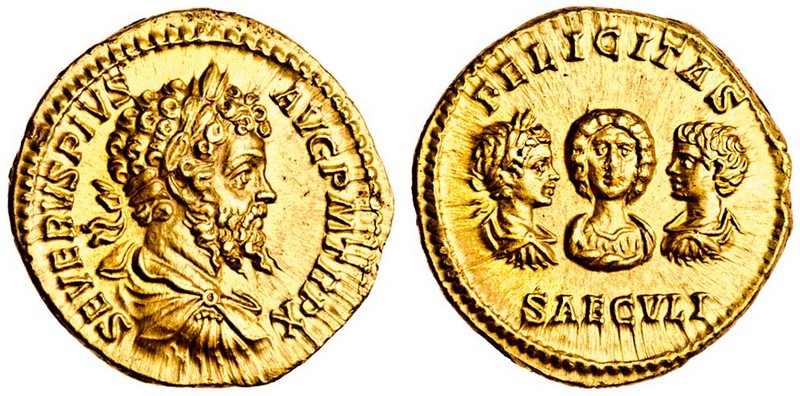 Septimius Severus (193-211), Aureus, 7.27g, Rome 202, dynastic type, laureate, bearded, draped and cuirassed bust of Septimius Severus right, severvs pivs avg p m tr p p x, rev. felicitas saecvli, facing draped bust of Julia Domna between right facing laureate and cuirassed bust of Caracalla and left facing draped and cuirassed bust of Geta (RIC 181B; BMC 379; C.4), a superb example, most attractive, good extremely fine