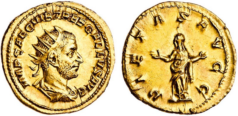 Trebonianus Gallus (251-53), Double Aureus or Binio, 6.90g, Rome, radiate, bearded and draped bust right, imp cae c vib treb gallvs avg, rev. pietas avgg, Pietas, veiled, standing left raising both hands (RIC 12; C.82) extremely fine, very rare