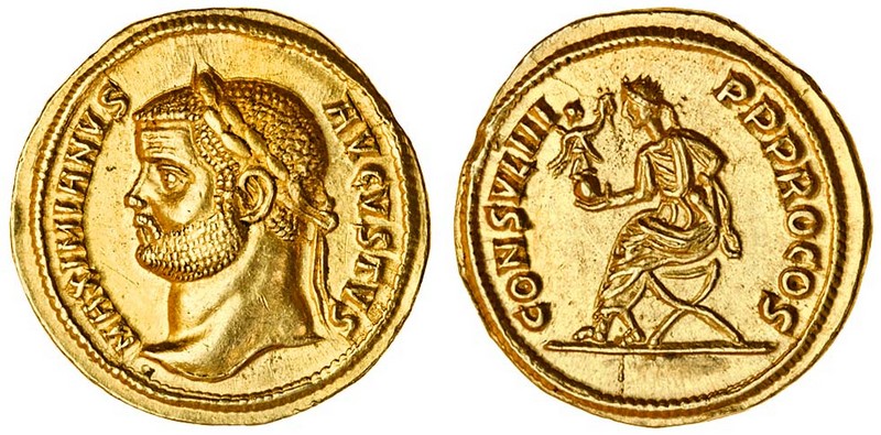 Maximianus (286-305), Aureus, 5.28g, Cyzicus, 291, laureate bearded bust left, maximianvs avgvstvs, rev. consvl iii p p procos, Maximianus, togate, seated left on curule chair holding Victory on globe (RIC V, ii, 596; Calico 4621; Depeyrot 11/5-6; C 78; RCV 12997) ,minor marks on neck, bold bust, extremely fine, rare