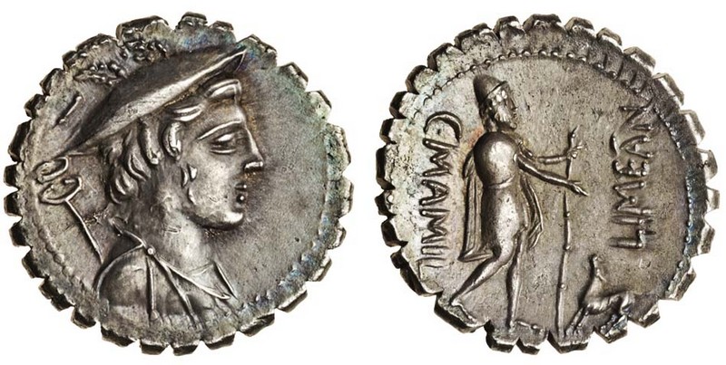 C. Memelius Limetanus (c.82 BC), serrate Denarius, 3.99g, bust of Mercury right, caduceus behind, rev. Ulysses walking right, his dog before. c.mamil, behind, limetan before (Cr.362/1; BMC 2716-29), even grey tone, well-centred especially on obverse, extremely fine
