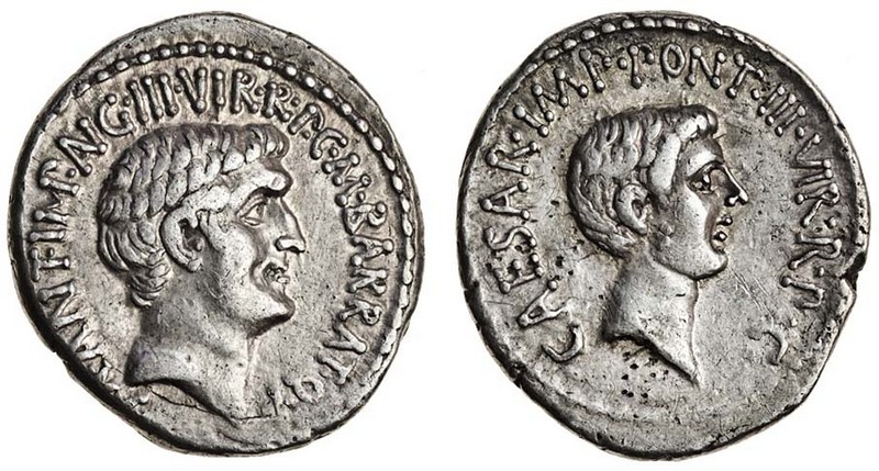 Mark Antony and Octavian, Denarius, 3.97g, Ephesus, Spring-Summer 41 BC, head of Mark Antony right, m. ant. imp. avg. iii. vir. r. p. c. m. barbat.q.p, rev. caesar. imp. pont. iii. vir. r. p. c., head of Octavian right (RSC 8; RRC 517/2), lightly toned, very fine
