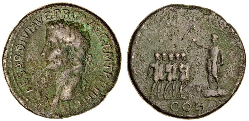 Caligula (AD 37-41), Sestertius, Rome, 40-41 (tr p iiii), laureate head left, rev. ad locvt coh, Gaius (Caligula) standing left on platform addressing five soldiers holding shields (RIC 48; BMC 68), good fine