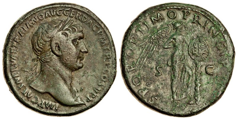 Trajan (AD 98-117), Sestertius, Rome, 106, laureate head right, drapery on far shoulder, rev. spqr optimo principi, s-c, Victory standing right, inscribing vic / dac on shield held on palm-stump (RIC 527; BMC 812; C. 454), dark green patina, very fine