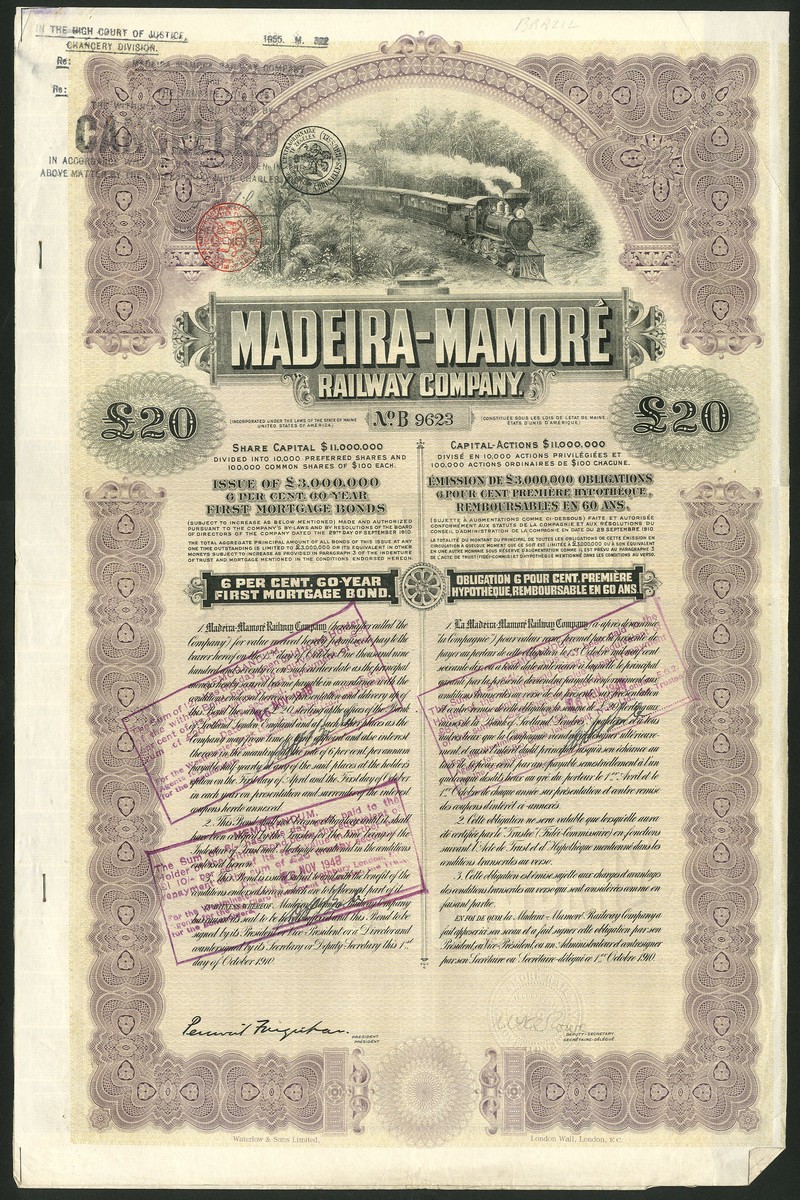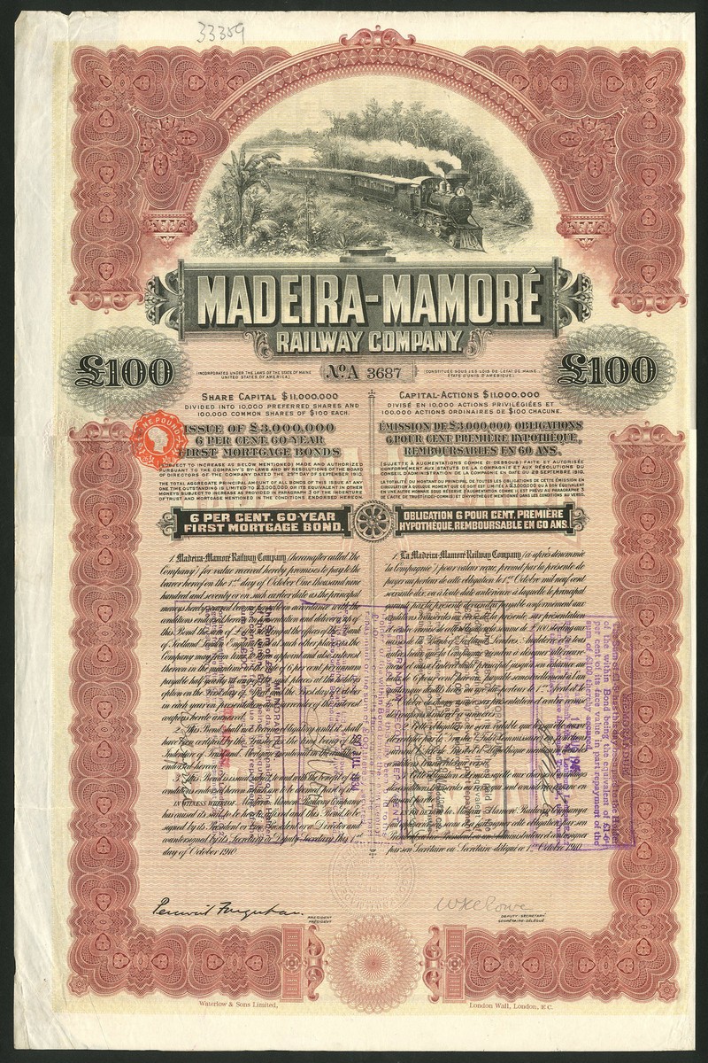 Madeira-Mamore Railway, 6% 60 Year Mortgage Bonds, 2 certificates for £20 and £100, 1910, Nos. B9623 and A3687, large vignette of steam train at top, ornate border, text in English and French, mauve and red respectively, printed by Waterlow & Sons, with coupons, good very fine (2)
