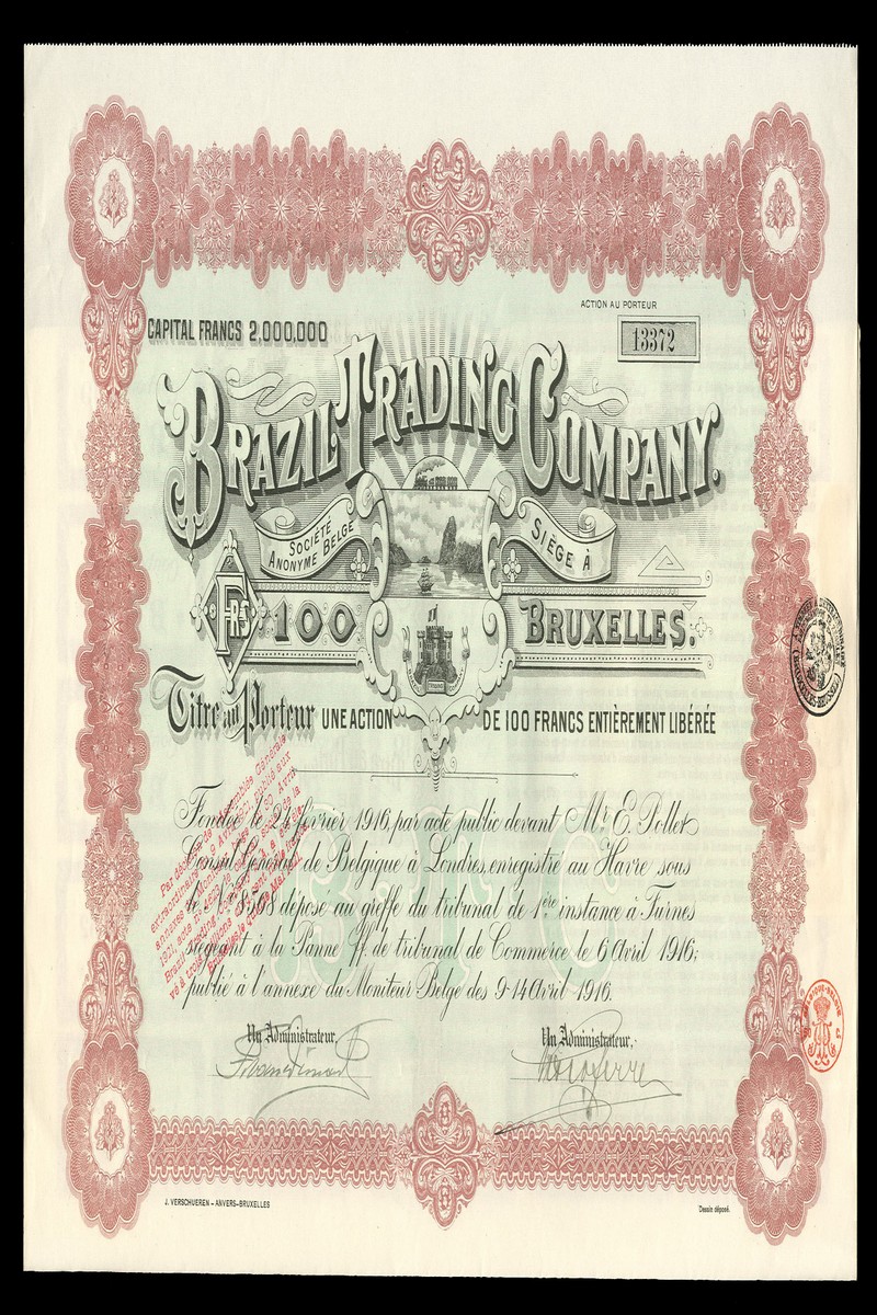 Brazil Trading Company, a group of 20 certificates for 100 franc shares, 1916, large format pieces with ornate border, red-brown with pale green underprint, with coupons, extremely fine. (20)