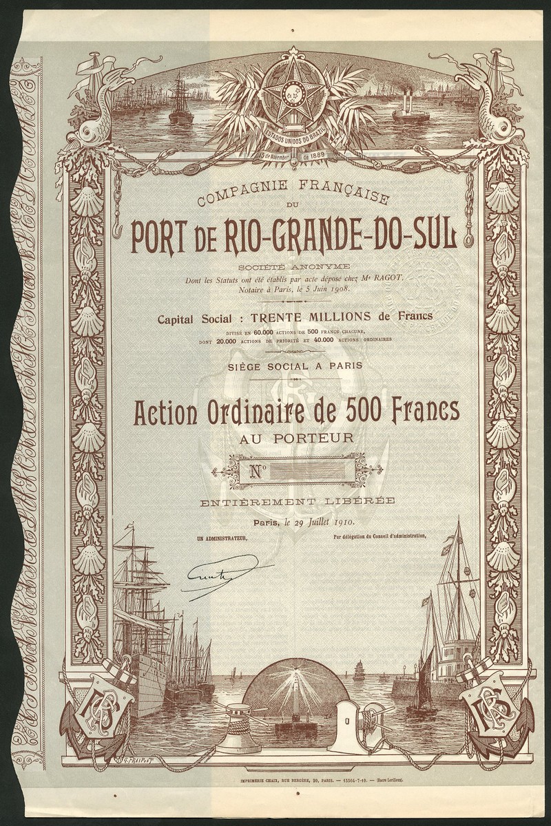 Co. Française du Port de Rio-Grande-Do-Sul, 500 Franc share, Paris 1910, un-issued, large vignette at top and bottom of sailing ships approaching and in port, decorative border incorporating sea shells, fish and nautical items, brown and grey, with coupons, extremely fine