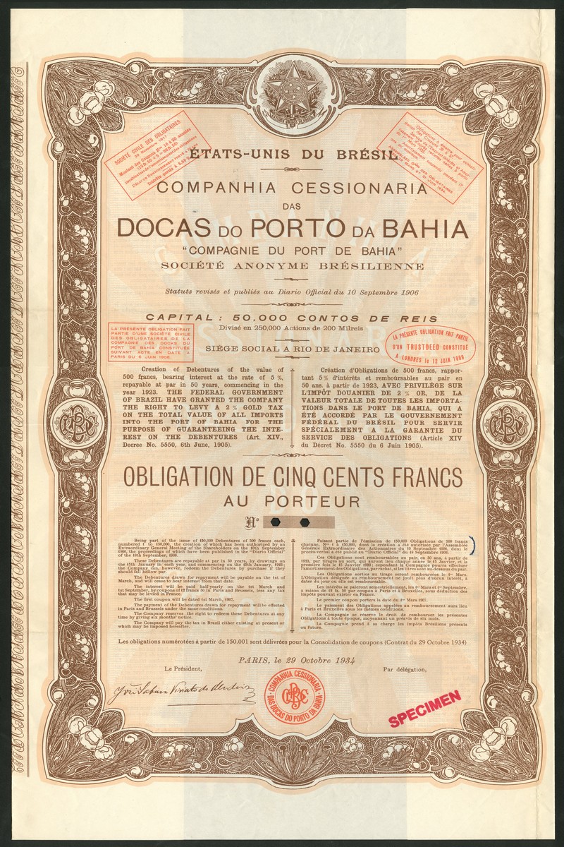 (x) Companhia Cessionaria dea Docas do porto da Bahia, a specimen bond for 500 francs, Paris 1934, large format piece with ornate floral border, Brazilian arms at top, brown, text in English and French, overprinted specimen at bottom, with coupons, about extremely fine.