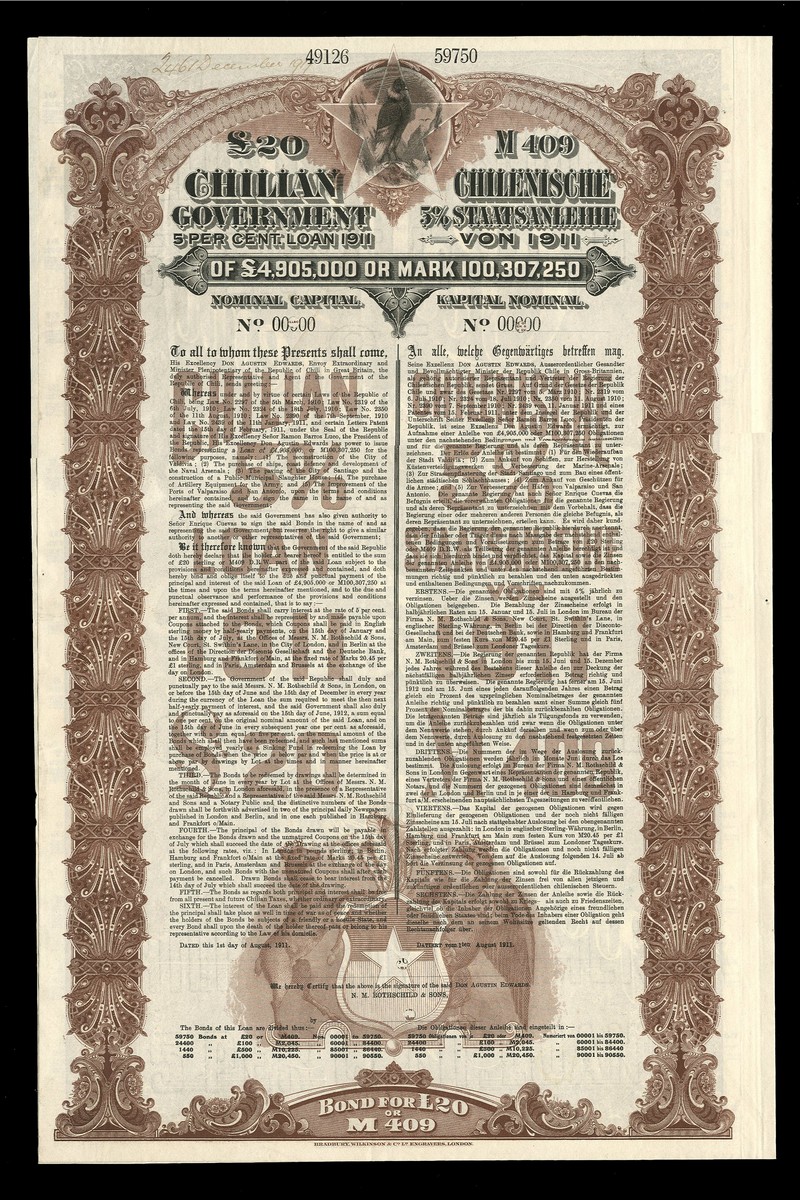 Chilian Government 5% State Loan of 1911, a specimen bond for £20 from the Bradbury, Wilkinson & Co. archive, large format piece with condor at top within star, brown and black with large coat of arms in underprint, text in English and German, with coupons, about extremely fine.