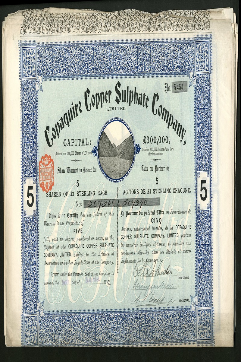 Copaquire Copper Sulphate Co. Ltd., a group of bearer certificates for 5 shares of £1 (10) and 10 shares of £1 (10), all 190[2], ornate borders with vignette of mountainous mining area, blue and black & brown and black with green underprint, with coupons, most are extremely fine. (20)