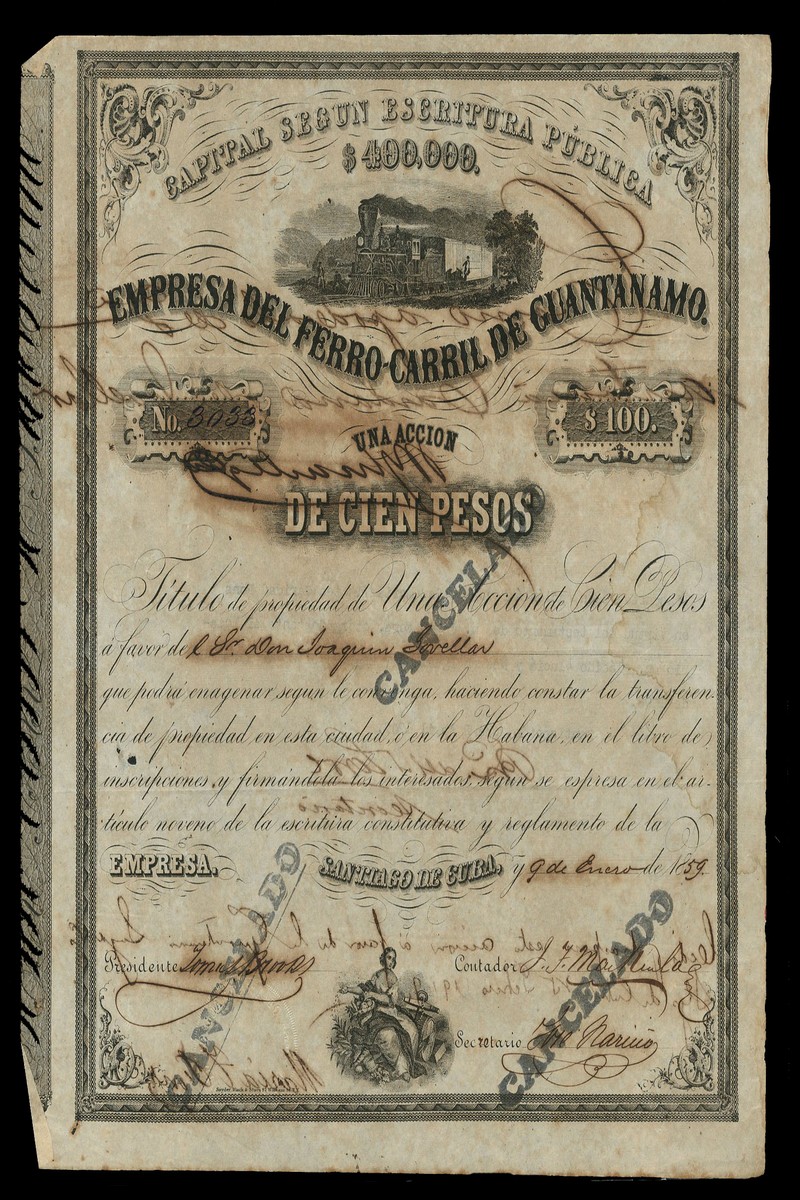 Empresa del Ferro-Carril de Guantanamo, 100 peso share, Santiago de Cuba 18[59], no.3033, ornate border, scrollwork at corners and small vignette at top of steam train on track, black, unfortunately some water and ink damage, fine