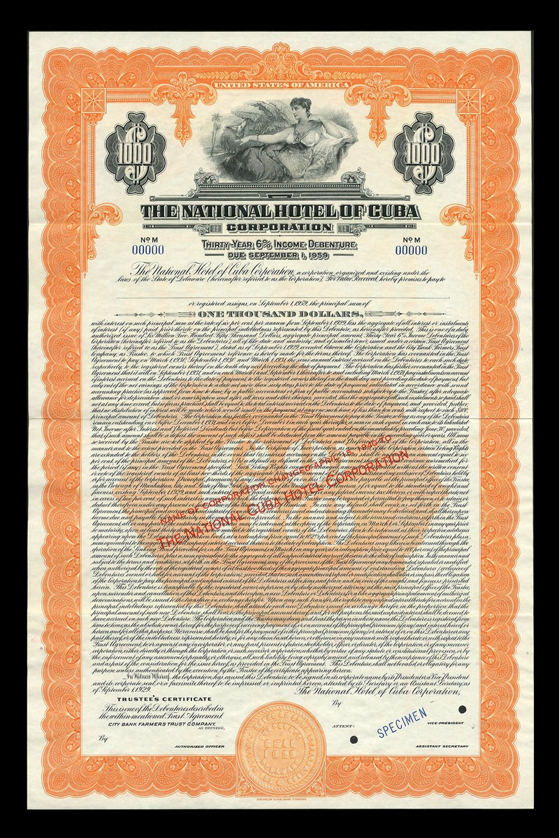 National Hotel of Cuba Corporation, a specimen 30-Year 6% income debenture for $1000, 1929, numbered 00000, allegorical female reclining at top, ornate border, orange and black, printed by the American bank Note Co., lacks coupons, tri-folded otherwise extremely fine.