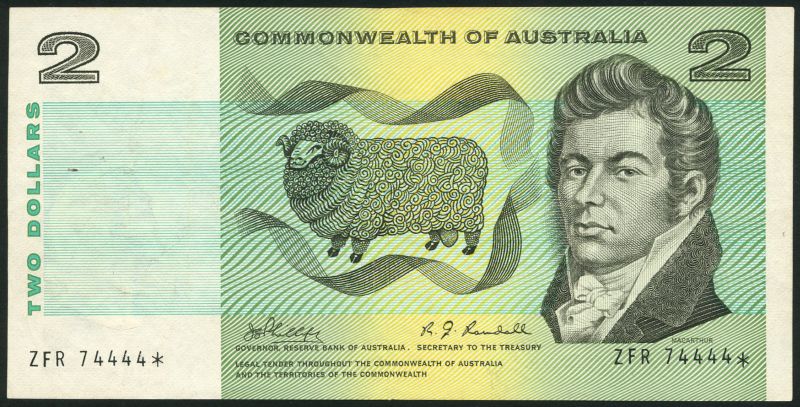 (x) Commonwealth of Australia, $2 (2) star suffix replacement note, ND (1968), prefixes ZFL,ZFR, green and multicoloured, John MacArthur at right, ram at centre, Phillips-Randall signatures respectively