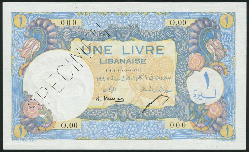 Banque de Syrie et du Liban, specimen 1 livre, 1945, zero serial numbers, blue and multicoloured, eagles at centre, Busson and Letayf signatures, ornate backgound detail, reverse blue and multicoloured, cedar tree and mountains, antelope head low left and right