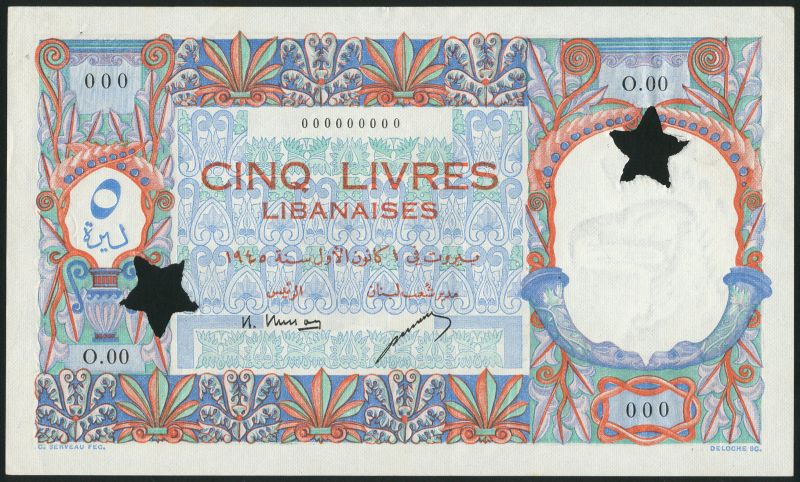 (x) Banque de Syrie et du Liban, Lebanon, specimen 5 livres, 1945, zero serial numbers, blue and multicoloured, vase at left, two drinking horns at right, Busson and Letayf signatures, reverse blue, Ras Beirut