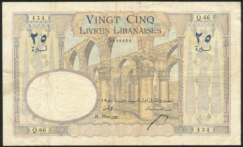 (x) Banque de Syrie et du Liban, Lebanon, 25 livres, 1950, serial number Q.66-434, pale blue and multicoloured, ruins of the Umayyad Mosque at centre, Busson and Letayf signatures, reverse lilac and multicoloured, lion's mask from Baalbek and border of flowers